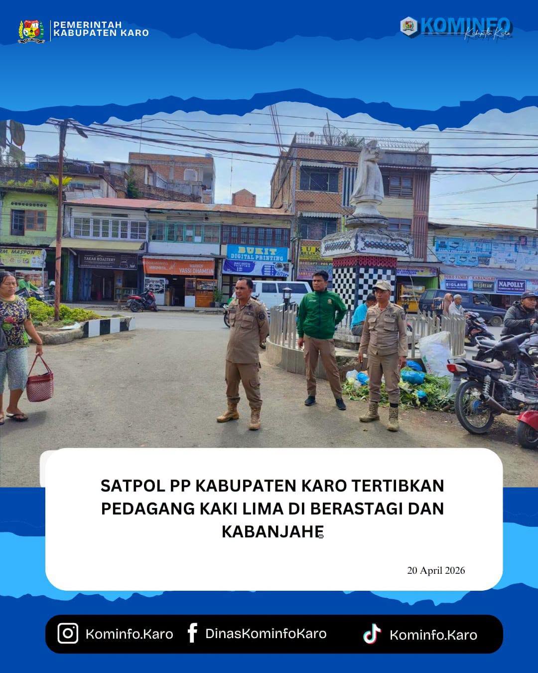 Bupati Karo, Brigjen Pol (Purn) Dr. dr. Antonius Ginting, Sp.OG, M.Kes, melalui Satuan Polisi Pamong Praja (Satpol PP) melaksanakan kegiatan penertiban pedagang kaki lima (PKL) di wilayah Kecamatan Berastagi dan Kecamatan Kabanjahe pada Senin (20/04/2026).